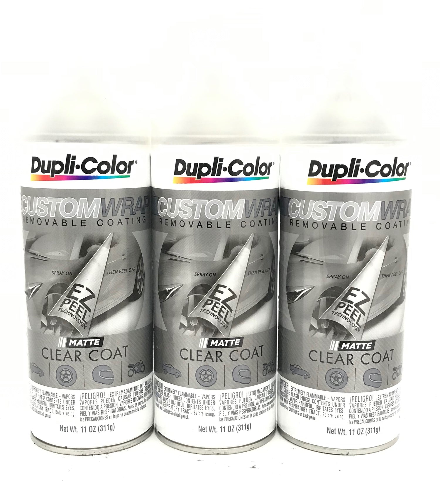 Three 11 oz aerosol spray cans of Duplicolor MATTE CLEAR Custom Wrap Removable Coating.