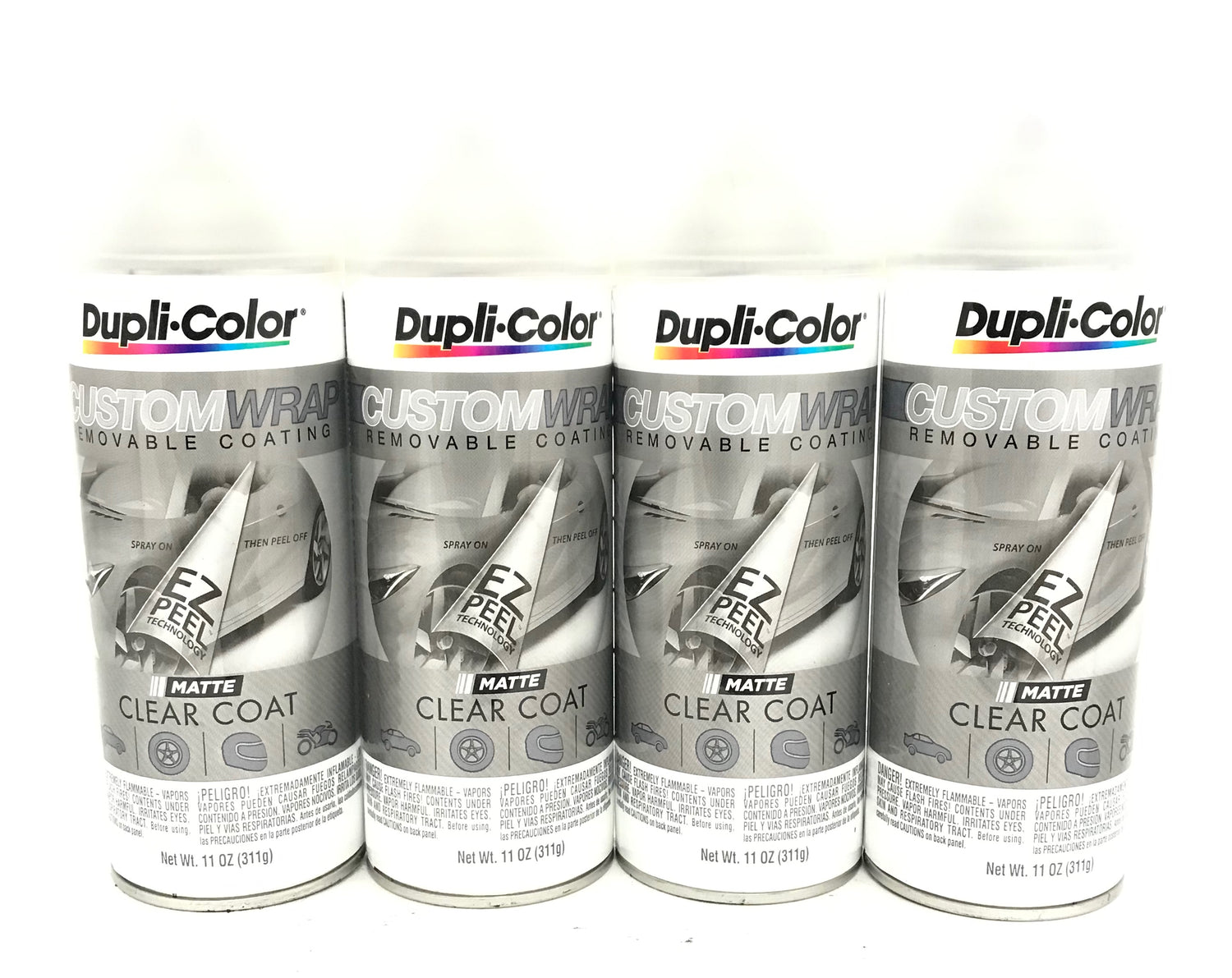 Four 11 oz aerosol spray cans of Duplicolor MATTE CLEAR Custom Wrap Removable Coating.