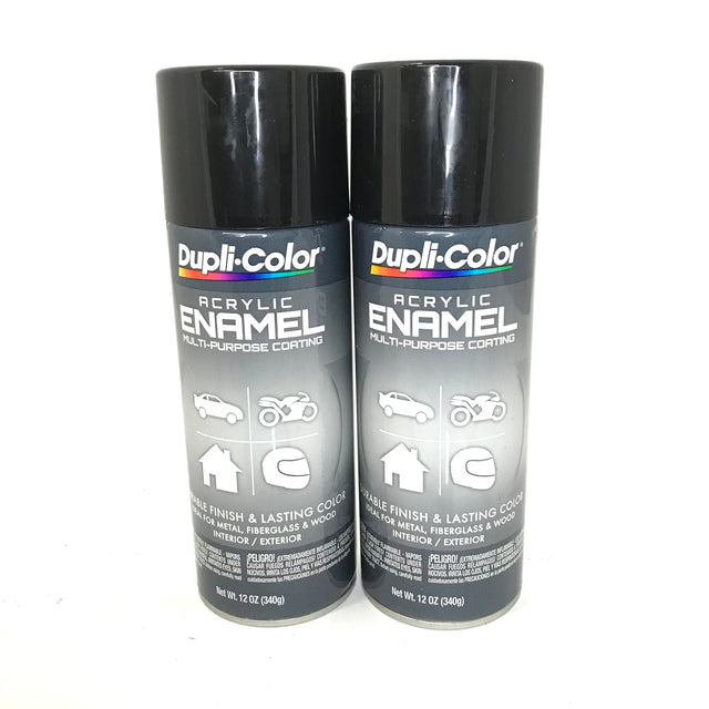 Two 12 oz aerosol spray cans of Duplicolor Gloss Black Acrylic Enamel Multi-Purpose Coating