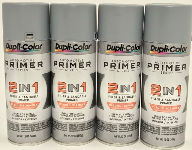 This is a 4 PACK 12 oz Aerosol spray can of Duplicolor 2-IN-1 Filler & Sandable Primer.