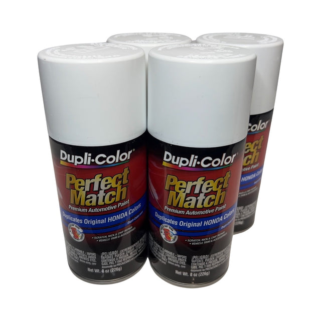 Four 8 oz. cans of Dupli-Color BHA0978 Honda Taffeta White Perfect Match Automotive Spray Paint.