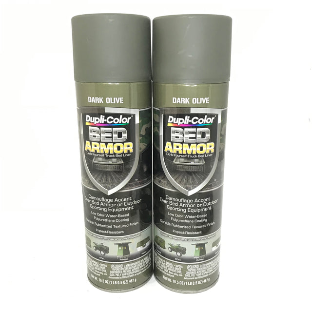 This is TWO 16.5 oz Aerosol spray cans of Duplicolor Dark Olive Camouflage Bed Armor.