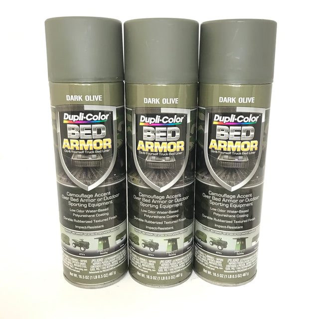 This is THREE 16.5 oz Aerosol spray cans of Duplicolor Dark Olive Camouflage Bed Armor.
