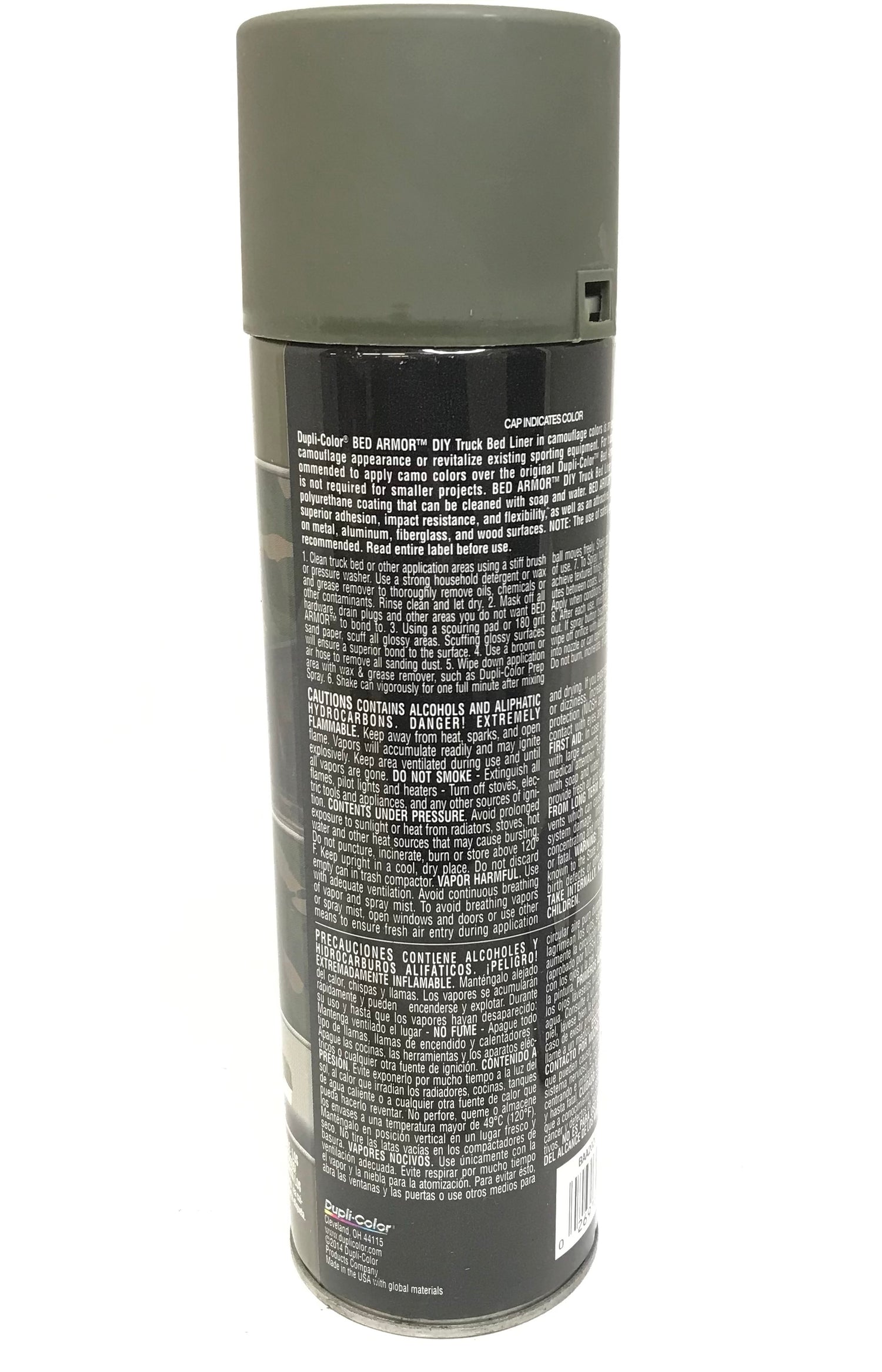 Duplicolor Bed Armor DIY Truck Bed Liner in camouflage colors is an excellent way to create a new camouflage appearance or revitalize existing sporting equipment. This is a low-odor water-based polyurethane coating that can be cleaned with soap and water. It offers superior adhesion, impact resistance, and flexibility, as well as an attractive, texturized finish.