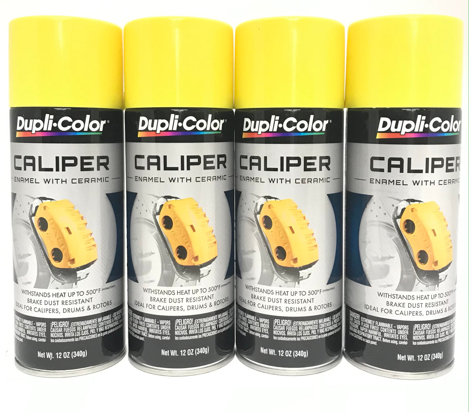 Four 12 oz. aerosol spray cans of Duplicolor yellow caliper paint with ceramic.