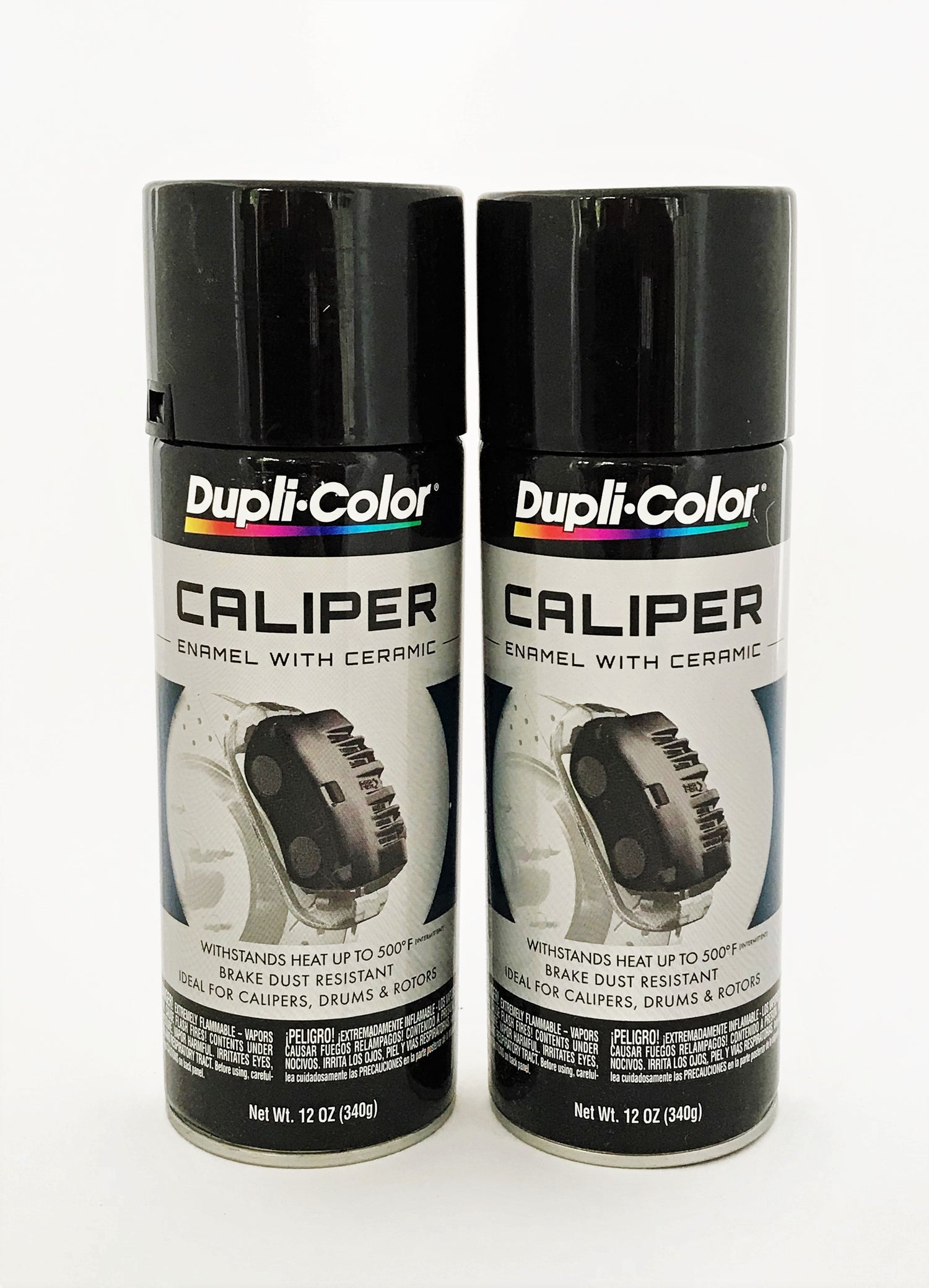 Two 12 oz. aerosol spray cans of Duplicolor black caliper paint with ceramic.