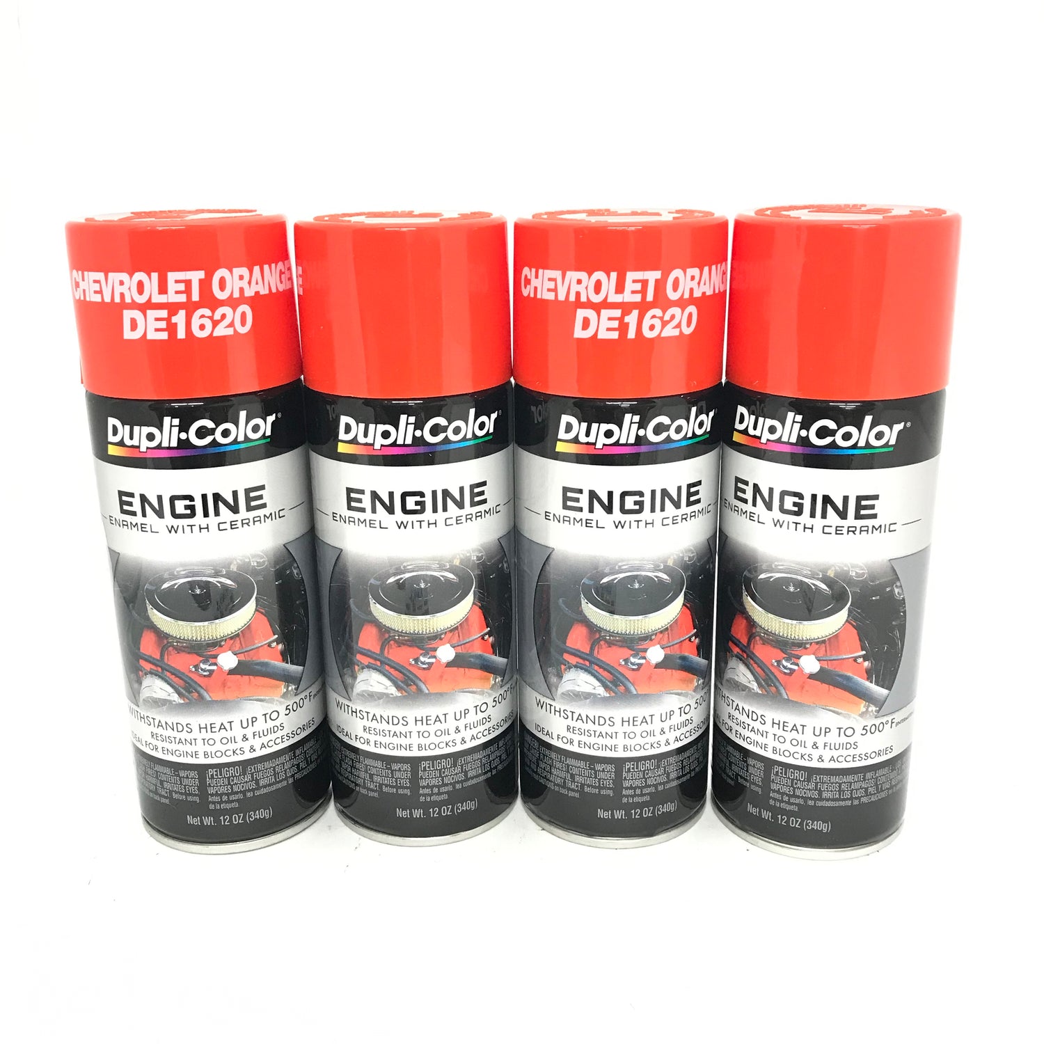 Four-pack of 12 oz aerosol spray cans of Duplicolor Chevrolet Orange Engine Enamel with Ceramic.