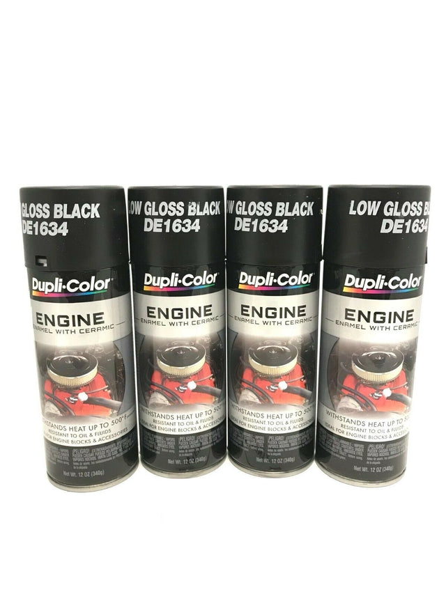 Four 12 oz aerosol spray cans of Duplicolor LOW GLOSS BLACK Engine Enamel with Ceramic.