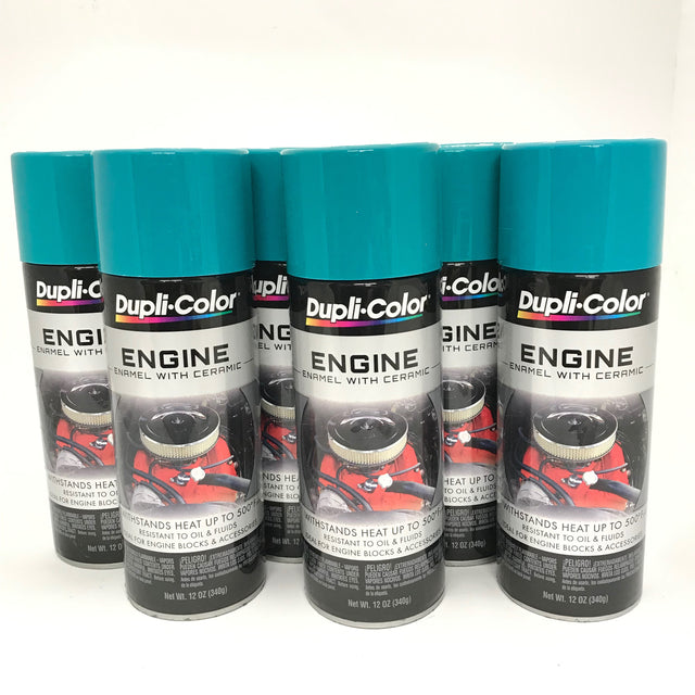 Six 12 oz. aerosol spray cans of Duplicolor Torque N Teal engine enamel with ceramic.