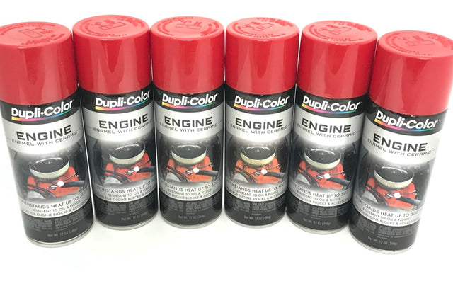 This is a 6pack 12 oz Aerosol spray can of Duplicolor RED Engine Enamel with Ceramic.