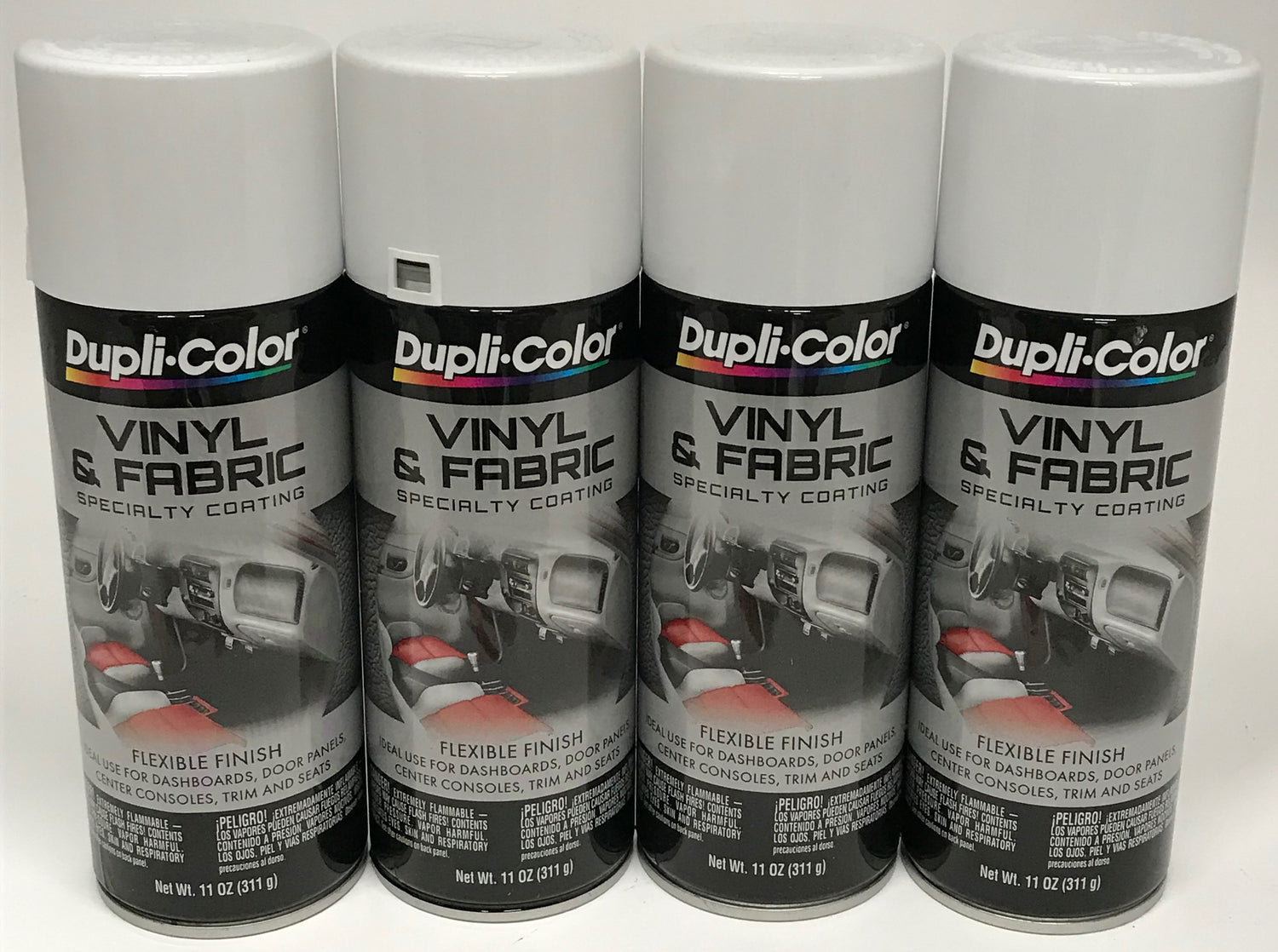 Four 11 oz. cans of Duplicolor White Vinyl and Fabric Paint.