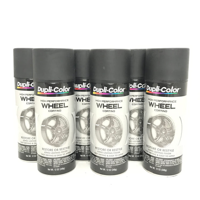 Six 12 oz aerosol spray cans of Duplicolor SATIN BLACK Wheel Coating.