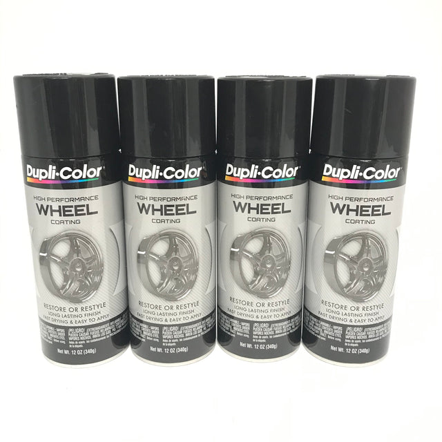 Four 12 oz aerosol spray cans of Duplicolor GLOSS BLACK Wheel Coating.