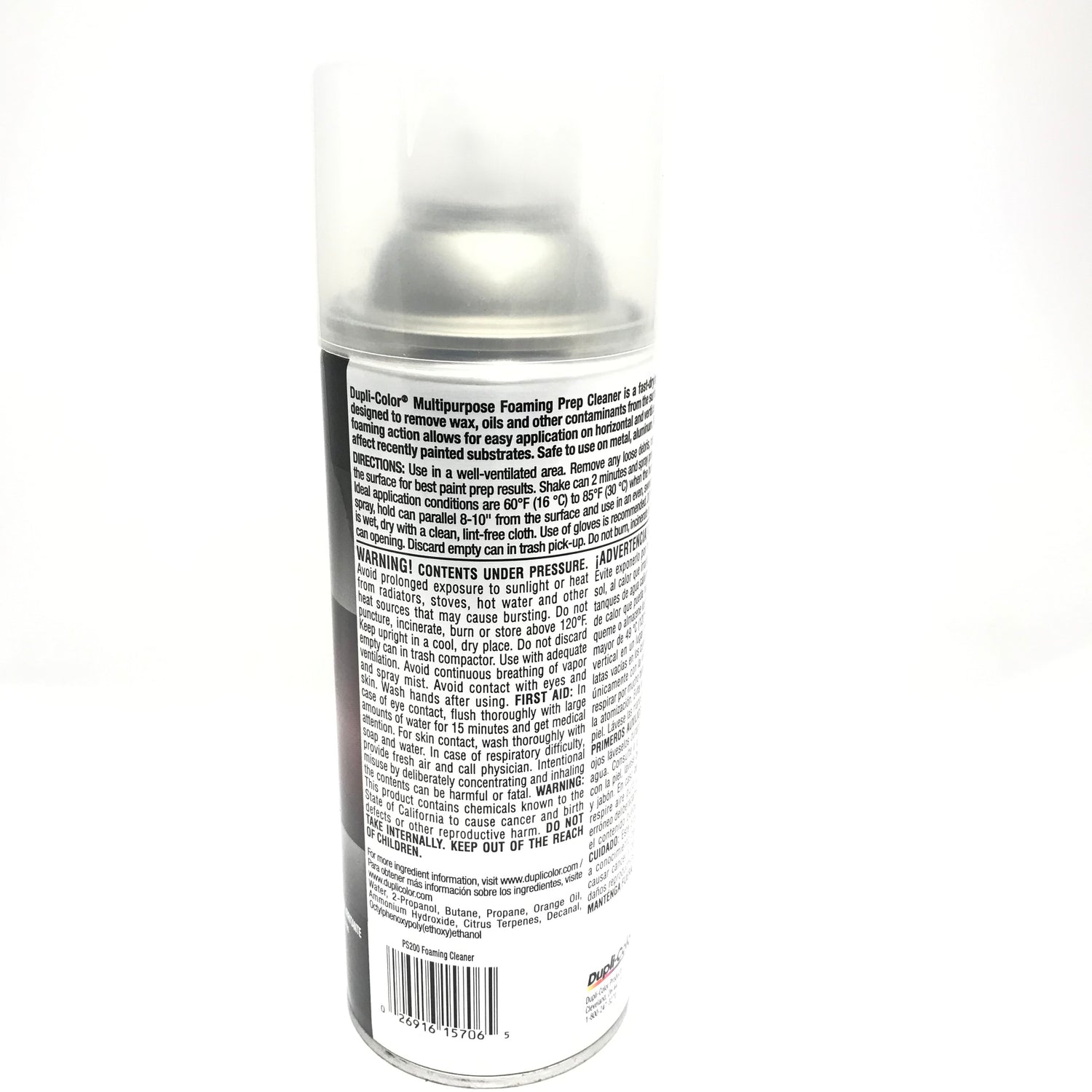 Dupli-Color Multipurpose Foaming Prep Cleaner is a fast-drying, waterborne formula designed to remove wax, oils and other contaminants from the surface with no residue. The foaming actions allow for easy application on horizontal and vertical surfaces and it will not affect recently painted substrates. Safe to use on metal, aluminum, fiberglass and plastic. This products maximizes paint performance and adhesion.
